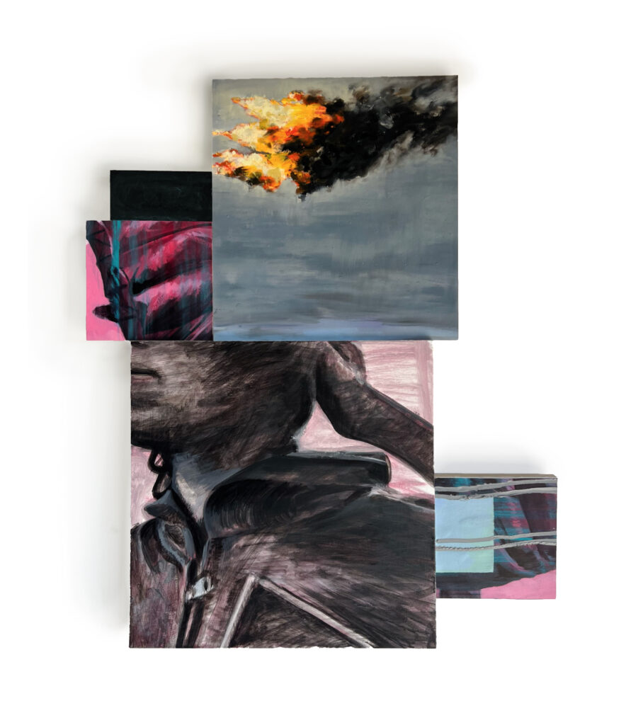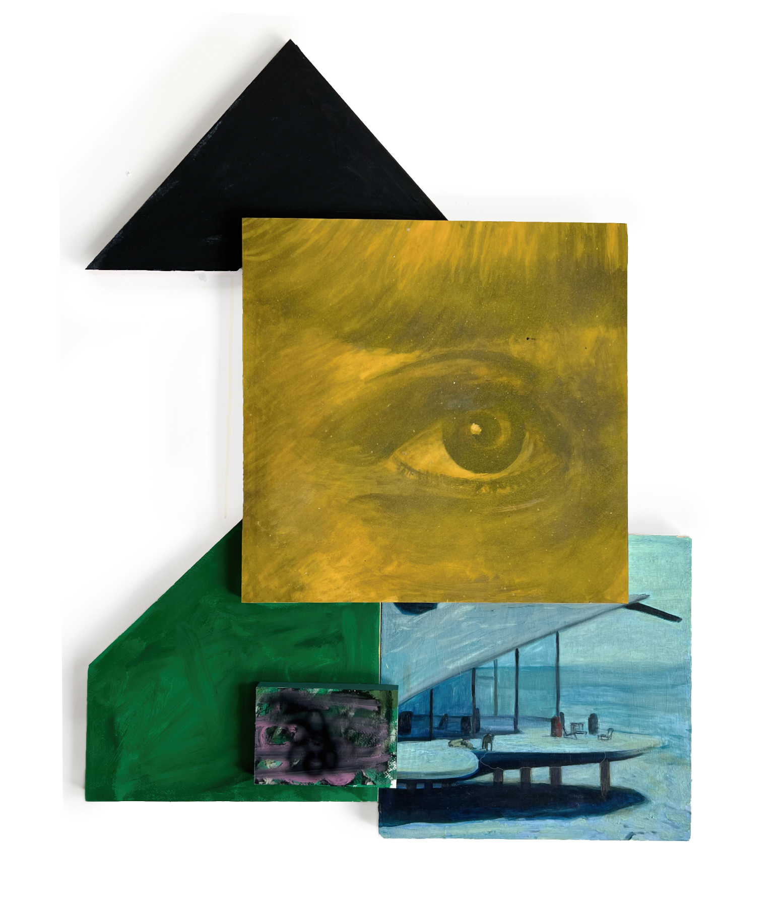 Dreams often resist logic, leaving behind impressions, blank spots, and flashes of recognition. My paintings embrace that instability. Found images drift in and out of context; blocks of color conceal as much as they reveal; absences carry as much weight as what remains visible.