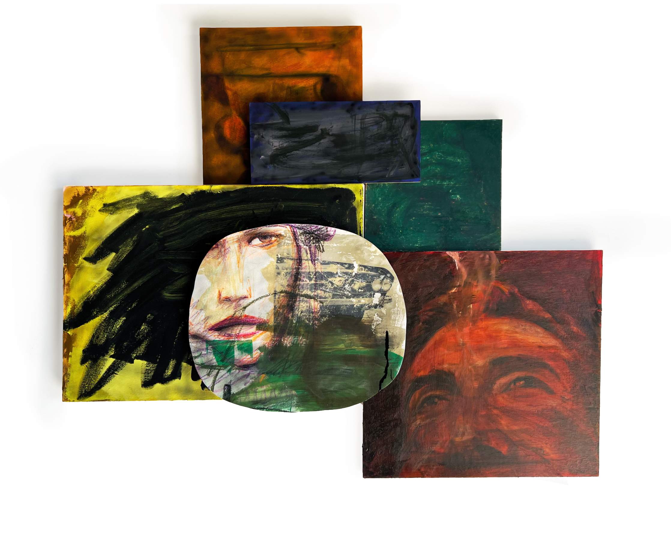 My work draws from the language of dreams—fragmented, symbolic, and emotionally charged. In painting, I use color blocks and found images to build shifting narratives that mirror the way dreams move between clarity and distortion. Each element is placed deliberately, yet the story remains elusive, like chasing meaning in the moment of waking.